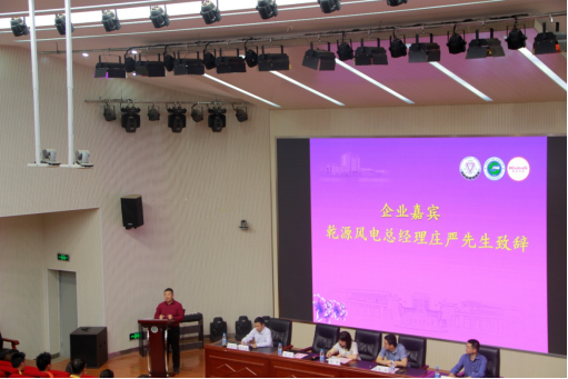 随后,由乾源风电总经理庄严先生致辞,他带来了产业发展的不少前沿信息,结合国家“3060”碳达峰碳中和发展目标,重点从人才培养到市场需求,谈到了可再生能源领域存在的巨大机遇,以及目前专业优秀技术人才方面存在的需求缺口,他鼓励在座的各位同学应努力奋进成为专业领域的高层次人才。