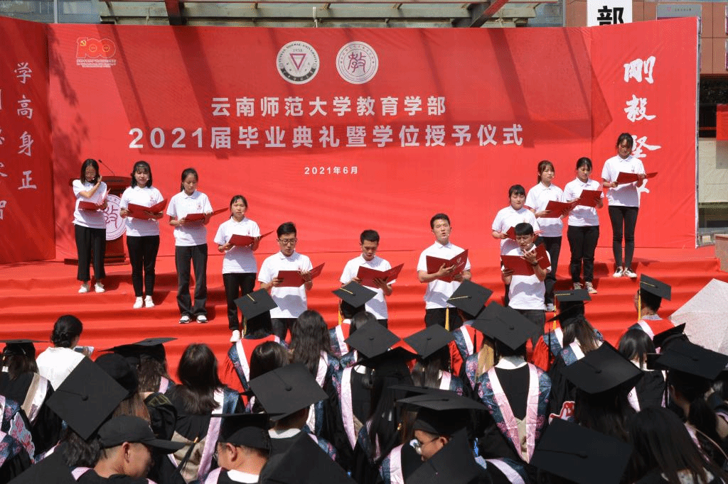 教育学部2021届毕业典礼暨学位授予仪式共分为致青春、念恩情、同向行三个篇章,期间有毕业生代表为老师献花、诗朗诵《广袤的土地》《我们的青年时代》等节目,旨在教育引导毕业生珍惜韶华,感恩母校和老师,牢记习近平总书记的嘱托,坚持与时代同向同行,立大志、明大德、成大才、当大任,努力成为堪当民族复兴重任的时代新人,让青春在为祖国、为人民、为民族、为人类的奉献中焕发出更加绚丽的光彩。