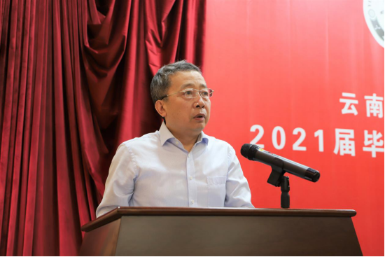 教师代表潘玉君教授为毕业生送上寄语。他饱含深情地说到,今年是他从教的第35年,地理学部历史悠久,同学们在地理学部刻苦学习、聆听教诲,涵养了高尚的情怀,掌握了为云南、为西南、为全国、为世界、为人类服务的真才实学。学部所有老师希望并且坚信大家会秉承西南联大师生“教书救国、读书报国”的精神,在将来的工作实践中取得更好的成绩,有更好的自我实现。