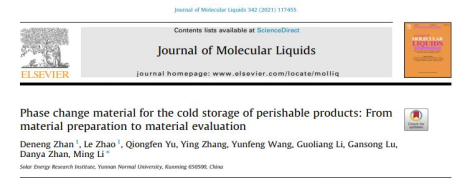 云南师范大学2018级新能源科学与工程专业本科生詹德能近期以第一作者在《Journal of Molecular Liquids》(中科院二区,IF=6.165)发表了“用于冷藏易腐产品的相变材料:从材料制备到材料评价”的论文,指导教师/通讯作者为课题组李明教授。该实验研究了新型相变材料的制备、表征和改性以及材料的循环利用对热物性的影响,所研究的新型相变材料在-4至-6℃的水果和海鲜冷藏运输系统中具有相当大的实际应用前景。詹德能同学作为项目负责人,目前主持并开展2020年度大学生创新创业训练计划项目《应用于冷链物流及空调系统的相变储能材料的制备及研究》,主持和参与多项与学科相关的创新创业竞赛并获奖。