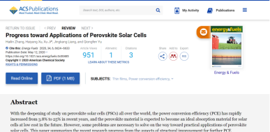 云南师范大学2017级农业建筑环境与能源工程专业本科生张海麟同学以第一作者在《Energy & fuels》上发表“Progress toward application of perovskite solar cells”的综述论文,指导教师/通讯作者为课题组季旭教授。文章从结构改进以进一步增强PCE、材料稳定性和寿命提高、大面积制备、有毒成分的替代、性能表征中滞后的解决等方面总结了近期的研究进展。作为共同作者发表论文“基于CFD模拟的住宅小区风环境的优化研究”、“基于风环境优化的住宅小区布局模式研究—以温和地区中等容积率的住宅小区为例”。作为负责人主持省级大学生创新训练项目“太阳电池方阵的一种无人机检测和清洗装置”,作为参与者参与省级大学生创新训练项目“微生物燃料电池供电渗析脱盐研究”,目前都已结题。