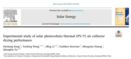 云南师范大学2017级新能源科学与工程专业本科生孔德成以第一作者在《Solar Energy》(中科院二区,IF=4.608)发表了“太阳能光伏/热(PV/T)空气集热干燥系统性能实验研究”的研究论文,指导教师/通讯作者为课题组王云峰教授。该工作对不同类型的太阳能PV/T空气集热器性能进行了研究,同时为解决干燥箱内部温湿度分布不均匀的问题,对干燥箱结构进行优化,进一步提高了系统干燥效率及物料干燥品质。孔德成同学本科期间在太阳能光伏光热综合利用、多能互补干燥方面主持并完成了云南师范大学科研训练基金及云南省大学生创新创业训练计划项目,均以优秀结题,主持多项与学科相关的创新创业竞赛并获奖。