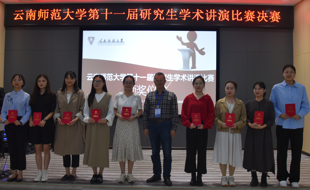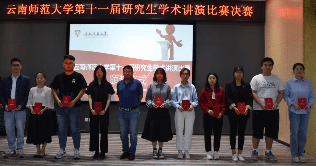 最后,在阵阵热烈的掌声中,骆华松院长、何跃教授、杨卫平教授以及评委代表分别为荣获研究生学术讲演比赛一、二、三等奖的同学颁发获奖证书,全体获奖研究生和评委专家一起合影留念。