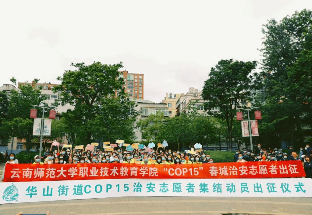 为迎接《生物多样性公约》缔约方大会第十五次会议(COP15)的召开,10月10日上午,职业技术教育学院与华山街道“COP15”春城治安志愿者出征仪式在昆明市五华区翠湖春晓广场举行。职业技术教育学院党委书记刘虹、副院长侯昌东,华山街道党工委书记付敏、办事处主任张祖田出席仪式,学院秘书学专业教师、140余名青年大学生志愿者以及华山东路派出所等相关人员参加了仪式。