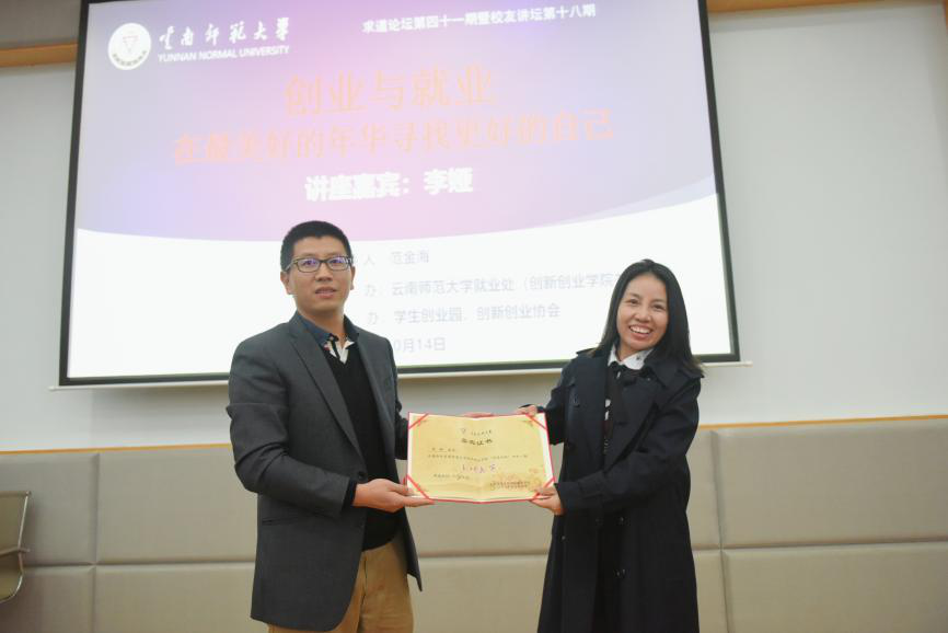 本期论坛邀请到我校2003届本科毕业生,云南米雅文化创始人李娅老师作为主讲嘉宾。李娅老师是一名职业经理人,中晔欣镕发展集团(云南)有限公司副总裁、恒弘会计师事务所投资人、昆明管仲科技总经理,一直致力于中华传统文化尤其是云南本土文化传播与发展,是云南铁路文化俱乐部的发起人。