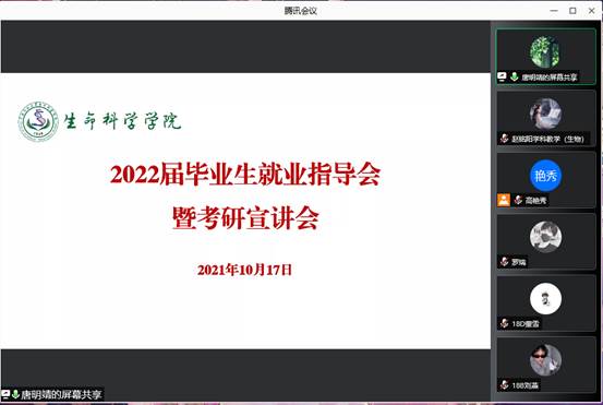 为了促进学院2022届毕业生就业和考研工作,生命科学学院于10月17日通过网络平台开展了2022届毕业生就业指导会暨考研宣讲会,会议由学院党委副书记唐明靖老师主持。