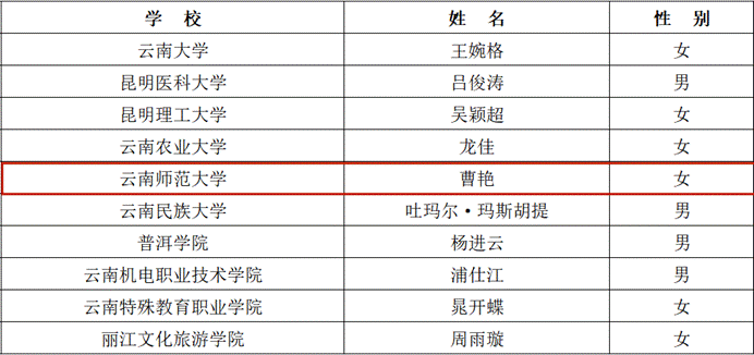 10月25日,云南省教育厅网站发布了第十六届云南省大学生年度人物评选公示名单,10人拟被评为“第十六届云南省大学生年度人物”。我校生命科学学院学生曹艳入选“第十六届云南省大学生年度人物”名单。