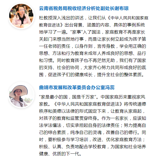 讲座结束后,观看直播的干部群众纷纷留言表示,《中华人民共和国家庭教育促进法》的出台,明确了国家责任和社会协同责任,家庭教育得到了前所未有的重视,全面学习掌握《中华人民共和国家庭教育促进法》对于每一个家庭、每一位家长意义重大。
