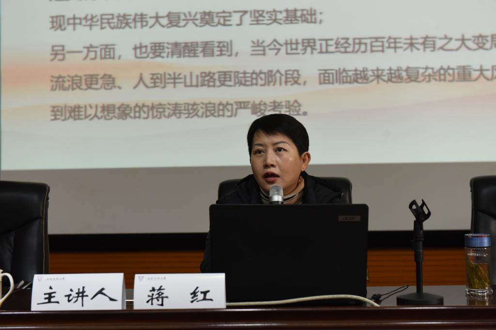 讲座中,蒋红教授从深入理解把握“七一”重要讲话精神的重要意义、深入理解把握“七一”重要讲话精神的主要内容、把学习贯彻落实“七一”重要讲话精神抓紧抓好等方面对“七一”重要讲话精神进行深入分析和阐述,带领师生对“七一”重要讲话精神进行了全面、系统、深入的学习。蒋红教授指出,习近平总书记“七一”重要讲话是一篇马克思主义的纲领性文件,是新时代中国共产党人不忘初心、牢记使命的政治宣言,是我们党团结带领人民以史为鉴、开创未来的行动指南,要在思想认识上增强自觉主动学习的意识,在学习方法上突出原原本本学、融会贯通学,在工作实践上不断将学习成果转换为工作动力。