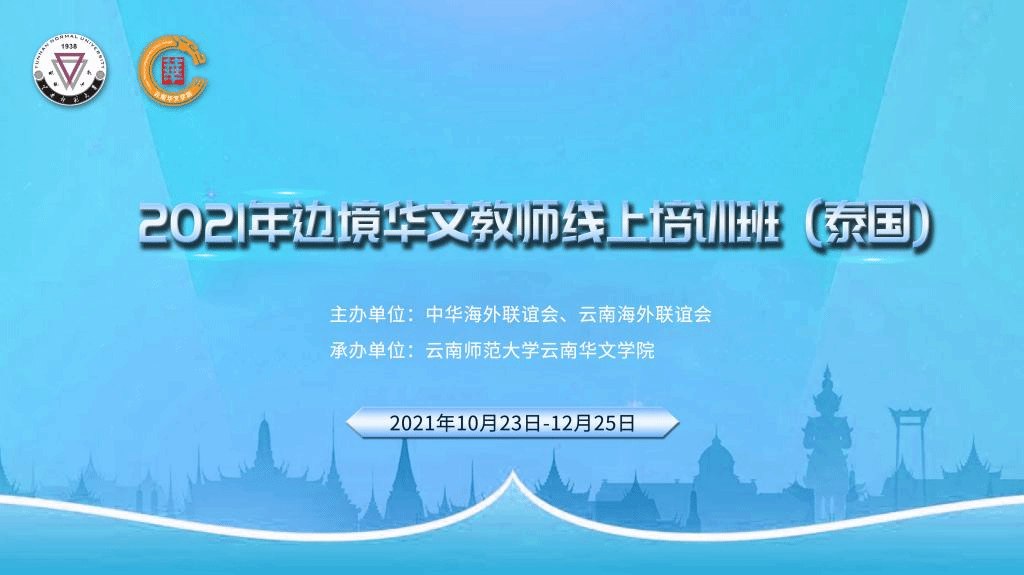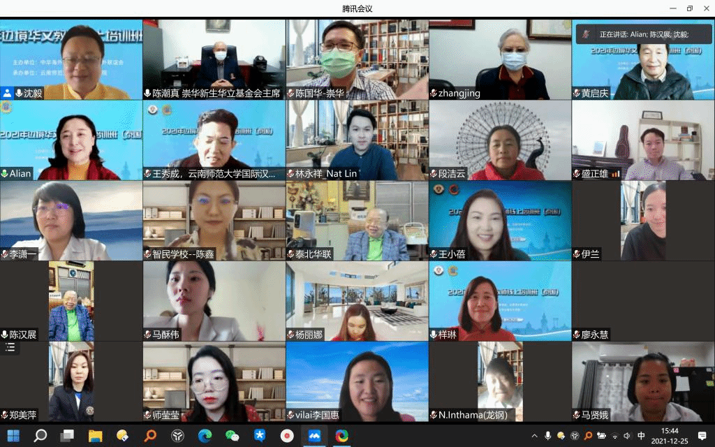 12月25日,由中华海外联谊会、云南海外联谊会主办,我校云南华文学院承办的2021年边境华文教师线上培训班(泰国)结业仪式顺利举行,泰国清迈崇华新生华立学校、南邦美速智民学校、北揽坡同德学校领导,云南华文学院党委书记和雪莲、院长王秀成、相关院领导,汉语国际教育推广师资培训基地相关负责人、授课教师代表及所有参训学员参加了结业仪式。仪式由汉语国际教育推广师资培训基地常务副主任沈毅教授主持。