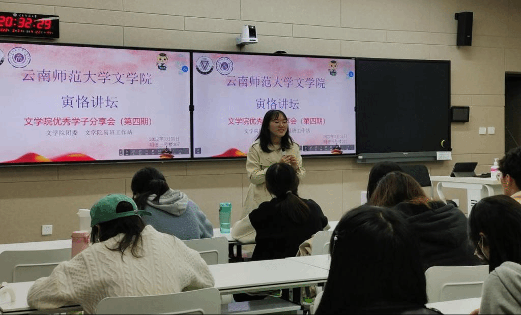 3月31日,为帮助同学们更好地规划大学生活,明确学习计划,文学院易班工作站在明德三号楼举行第四期“寅恪讲坛——文学院优秀学子分享会”,学院两位省级三好学生获得者王云叨和王洁梅同学进行分享。