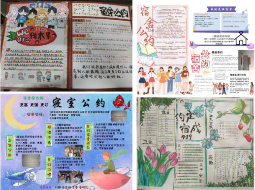 本次比赛以宿舍为单位全员参与,通过共同制定具有各自宿舍特色的公约内容,并运用绘制手抄报或者制作电子海报的形式展示公约,最终评委结合公约内涵和展示成果进行综合评分。比赛期间,同学们积极参与,各寝室展开热烈讨论,根据生活作息、内务卫生、宿舍交流、学习规划等多个版块设计制订公约。每一份参赛作品既体现了积极向上、团结友爱的宿舍氛围,又别具一格,充满正能量,展现了新时代青年阳光奋进的精神风貌。最终从众多作品共产生一等奖8名,二等奖11名,三等奖12名。