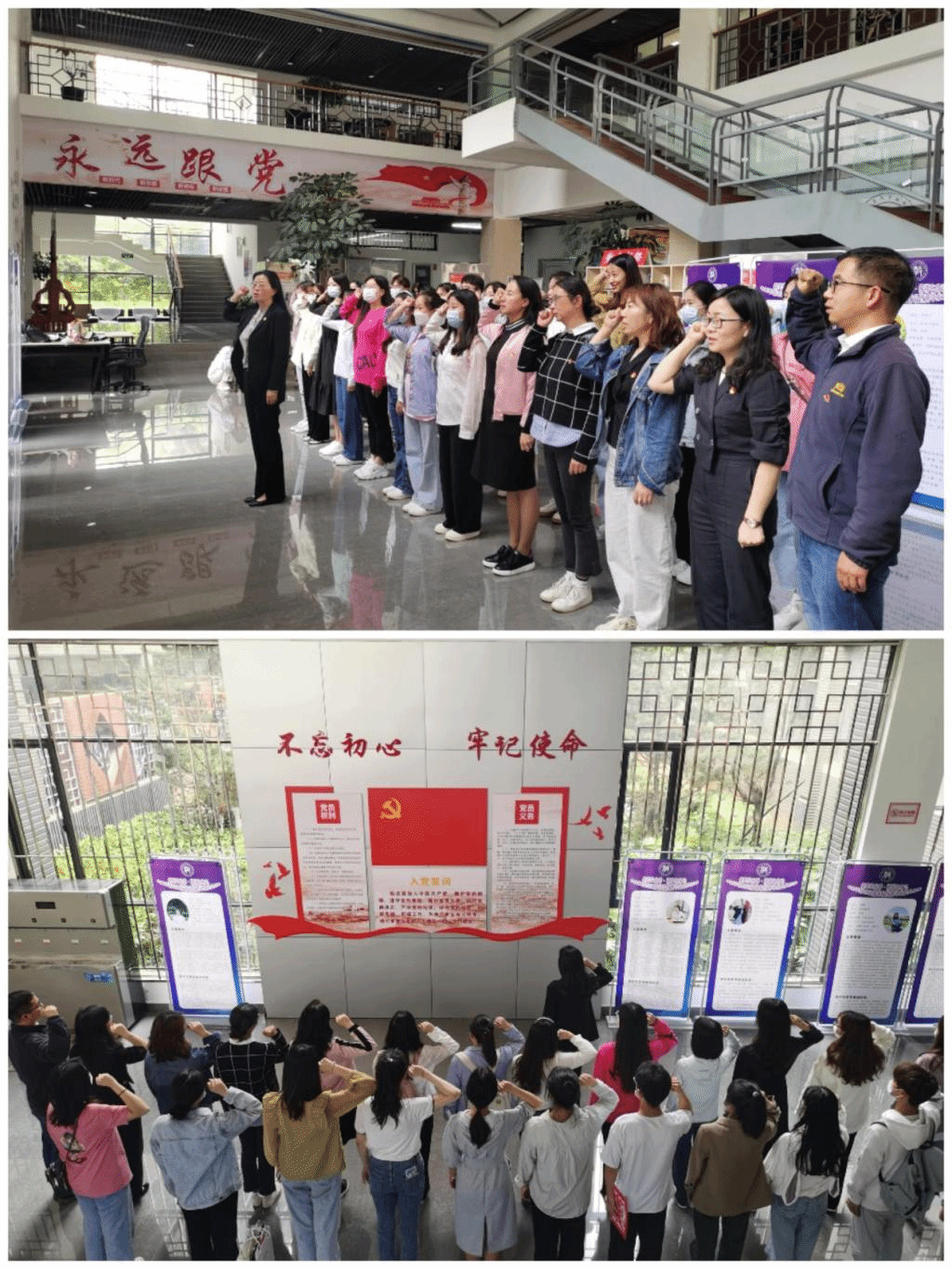 分享结束以后,教学质量监控与评估中心主任韦颖作为领誓人,带领大家重温入党誓词。随后,全体师生党员来到校史馆参观学习。讲解员用深入浅出的语言为大家介绍了云南师范大学的光荣历史和日新月异的发展成就,全体党员进一步深化了对“刚毅坚卓”校训的感悟,进一步坚定了勤奋工作、认真学习,为推动学校高质量发展贡献力量的决心。