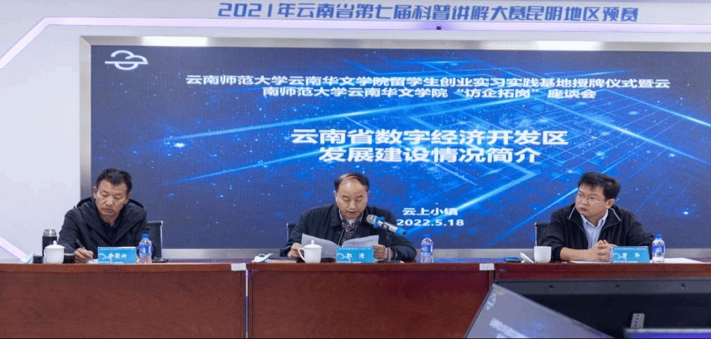 为提升国际学生人才培养质量,促进中外学生就业创业,5月18日下午,云南华文学院留学生创业实习实践基地授牌仪式暨“访企拓岗促就业”座谈会在云南云上云大数据产业发展有限公司顺利举行。云南华文学院王秀成院长一行,昆明呈贡信息产业园区管理委员会郭清副主任,云南云上云大数据产业发展有限公司金玉磊副总经理一行,以及10余家企业代表参加了揭牌仪式和座谈会。