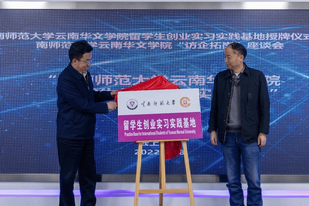 在与会人员的共同见证下,郭清副主任和王秀成院长共同为云南师范大学云南华文学院“留学生创业实习实践基地”揭牌,开启了产教融合、校企合作的新篇章。