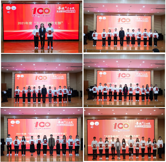颁奖典礼上,与会领导依次为2021年度“五四红旗团支部”“优秀共青团干部”“优秀共青团员”和“团学活动积极分子”,2021年度“省级先进班集体”优秀团支书等获奖集体和个人颁奖。