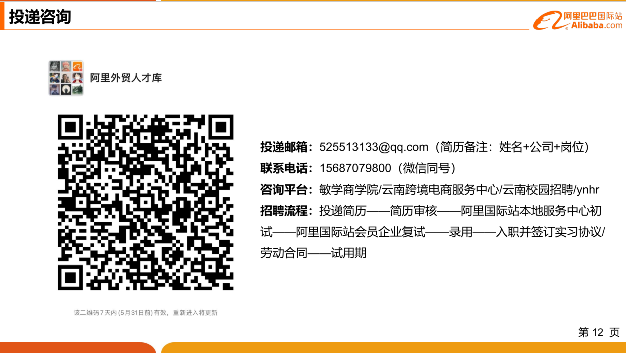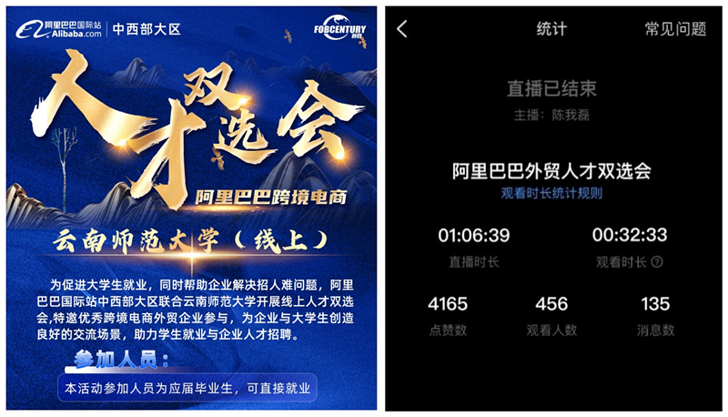 本次双选会,阿里巴巴国际站中西部大区为我校特邀云南本地十余家优质电商外贸企业参与线上招聘,为学生提供了国际站运营、运营助理、外贸业务员等职位。招聘会上,阿里巴巴方主持人陈我磊对跨境B2B行业的发展进行了基本介绍,并从企业岗位需求分析、学生面试建议等角度进行了系统的讲解。