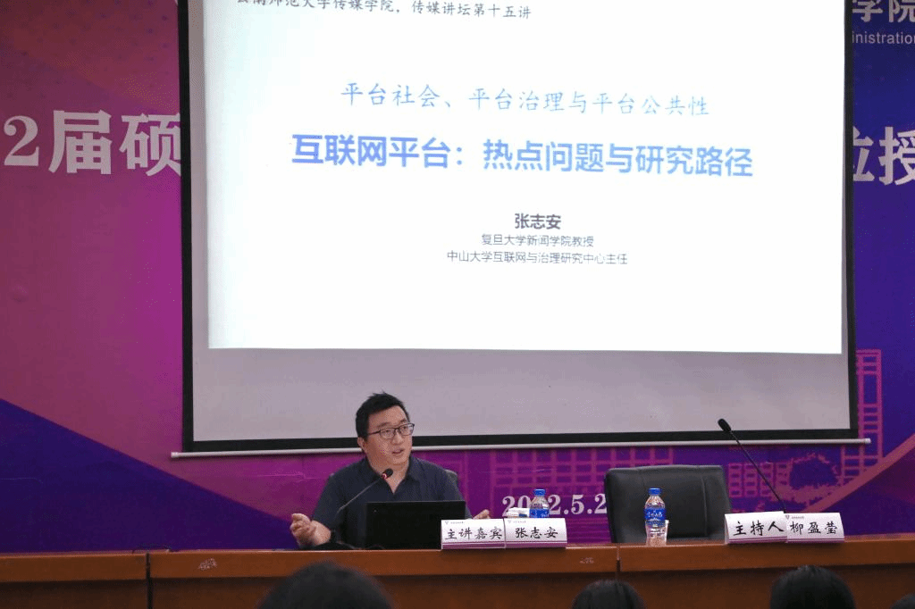 讲座伊始,张志安教授对传媒学院师生表示感谢,对自己从研究调查记者与深度报道转向新闻生产与社会控制,进而进入到数字新闻业领域,深耕平台研究的经历进行了简要回顾。他结合当今热点话题指出“平台”无处不在,将其作为研究对象具有重要研究价值。以“一部手机游云南”和腾讯公司2021宣传片《实体经济》为例,他指出互联网平台作为公共基础设施嵌入数字政府建设、促进国家发展的深层逻辑,进而引出本次讲座的三个核心问题:互联网平台在全球如何兴起、互联网平台研究的领域的关键问题及新闻传播学研究的路径思考。