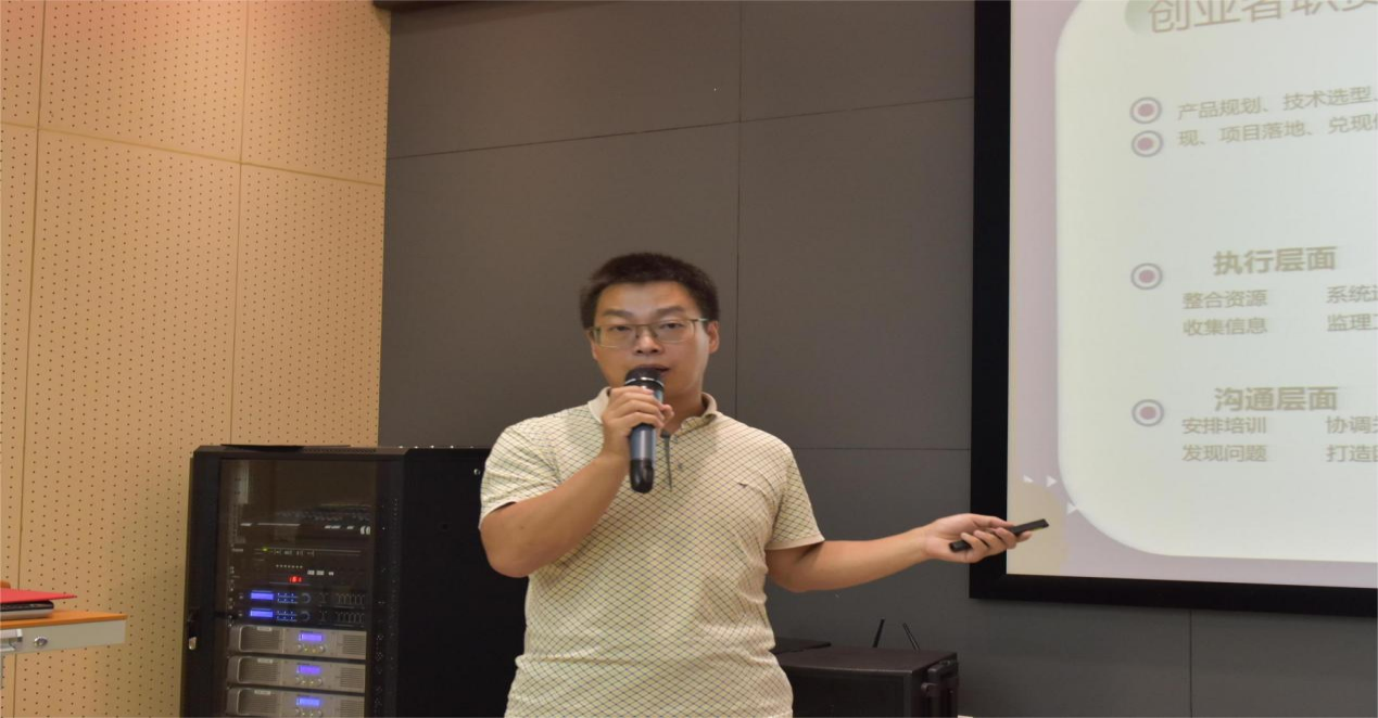 薛辉长期从事计算机信息管理系统研发和企业经营管理实务工作,创新创业知识丰富。他结合具体案例,围绕创业的点线面展开分享,从项目背景、个人职责、项目情况、项目效益四个方面为同学们分析了他的项目经历,同时与同学们分享工作经验。他建议同学们创业前应该思考如何了解一块业务面、总结出一条流程线、找准一个创业点。针对同学们提出的问题,他做了针对性的解答。