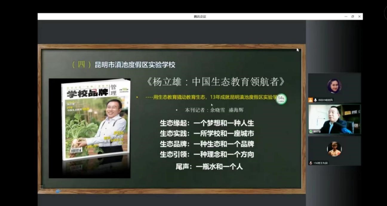 杨立雄以教育管理的工作经历为主线,从自己当校长的简历、当校长期间的学校简况、当校长时的所作所为、当校长过程中的实践反思和当教育部领航名校长工作室主持人的经验分享五个方面为学员集中阐述了如何带领好教师团队,如何引领教师成长,如何做一名好校长。他指出好校长一定要把课程建设作为中心工作来抓,要让课程文化成为校长的文化自觉。他还用生态学理论来指导学校进行生态环境建设,引领学校绿色发展,并创造性地提出了“让学习像呼吸一样自然,让学生成为最好的自己”的生态目标,展现了携手现代化、追逐国际化、引领生态化的发展路径。他坚持扎根课堂,为学生、教师和校长上好每一节生态环境教育课,讲好每一个生态文明讲座。在他的努力下,他所带领的学校及学校里的学生和老师都得到了良性的成长。此外,在实践反思中,他进一步提出当校长要抓好教师队伍、组织机构、干部培养、课程课堂四个关键。要能规划好学校的发展路径,营造育人文化,领导课程教学,优化内部管理,调适外部环境。