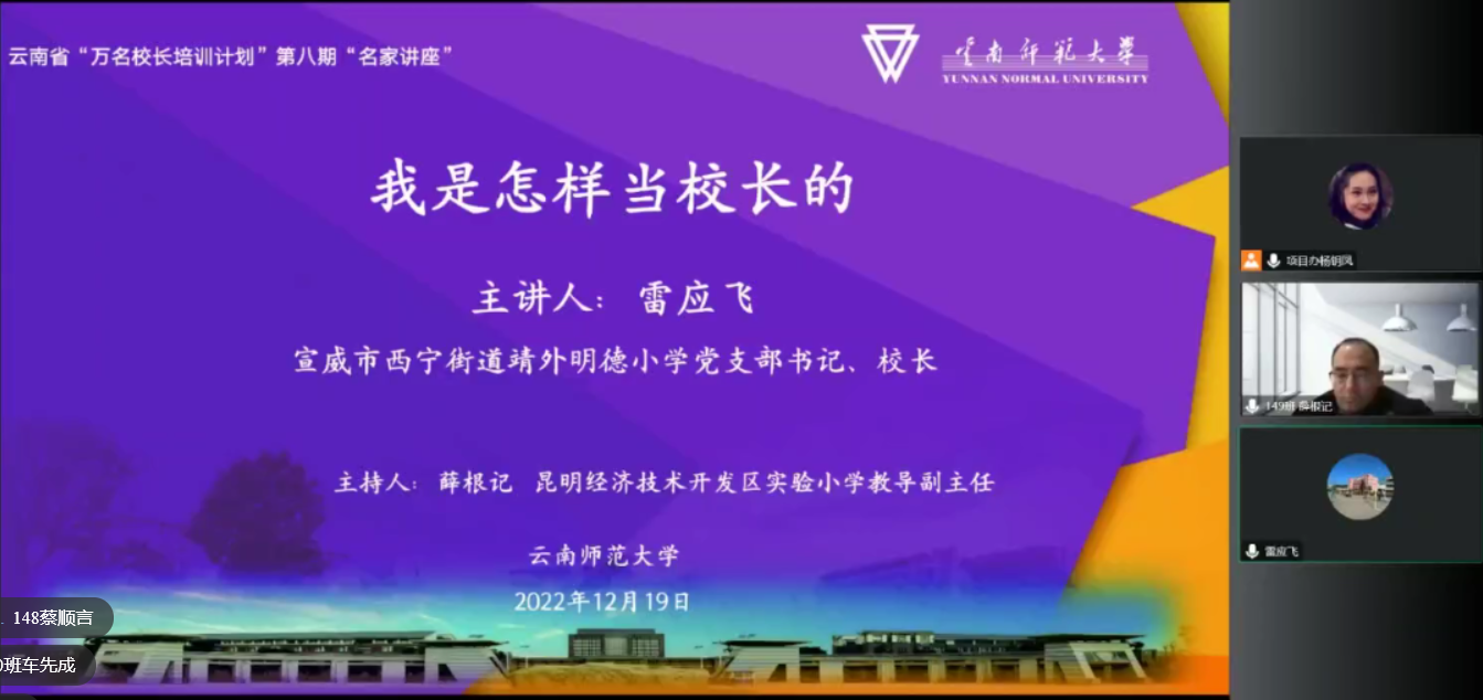 12月19日,云南省“万名校长培训计划”第八期“名家讲座”第三十九讲线上开讲。云南省曲靖市宣威市靖外明德小学党支部书记、校长雷应飞作了《我是怎样当校长的》专题讲座。