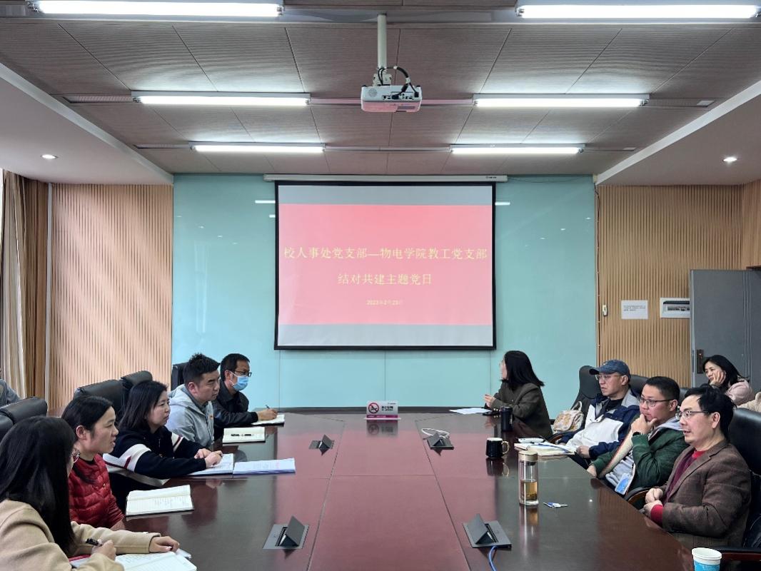 为深入学习贯彻党的二十大精神,进一步增强基层党组织政治功能和组织功能,加强职能部门和学院的沟通交流,实现党建和业务工作融合促进,2月23日,校人事处党支部与物电学院教工党支部在物电学院党员之家共同开展主题党日活动。