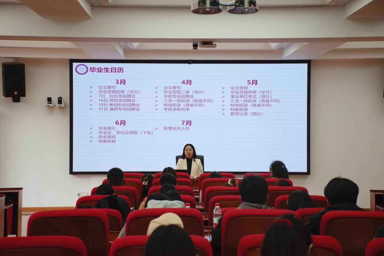 为深入学习贯彻党的二十大精神,落实党中央、国务院“稳就业”“保就业”决策部署,抢抓春季开学促就业工作关键期,全力促进高校毕业生顺利就业、尽早就业。3月2日,职业技术教育学院在学校召开2023届毕业生“开学第一课”后,及时组织2023届毕业生召开职业技术教育学院“开学第一课”暨毕业生动员大会。学院党委书记刘虹、院长牛元帅、党委副书记向斯楠、副院长王黎智、侯昌东,毕业班班主任、辅导员及2023届全体毕业生参加会议。