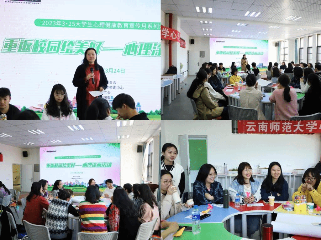 为关爱大学生心理健康,帮助学生群体敞开心扉、释放压力,3月24日,校妇女联合会、心理健康教育咨询中心、校工会、校团委、美术学院联合开展3. 25大学生心理健康教育宣传月系列活动之“重返校园绘美好——心理涂画活动”。全校50余名师生参加此次心理涂画活动。