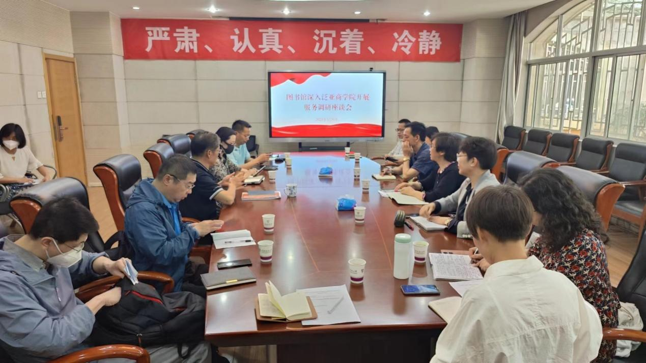 调研会上,泛亚商学院党委书记和向朝首先介绍了学院的基本情况、教学科研和特色党建工作,与图书馆党总支书记王顺英交流了党建工作与业务工作有效融合的办法和经验。随后图书馆听取了泛亚商学院师生对专业文献资源的需求,以及在利用图书馆时遇到的困难和问题。根据现场了解到的情况,图书馆馆长殷国聪和业务骨干对馆藏纸质文献与数据库资源的收藏情况及其如何获取和有效利用做了有针对性的解答回复和宣传介绍,双方围绕专业文献保障、案例库建设、馆际互借与文献传递服务、论文查收查引、信息素养能力培养和读书活动开展等方面进行了交流,探讨了合作的途径方法。