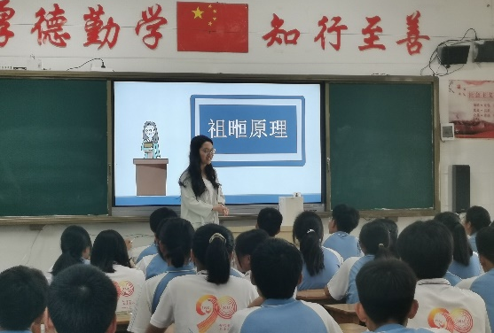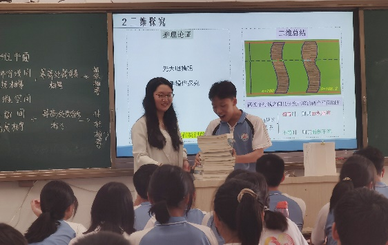本次活动由我校数学学院教师团队指导,在孔德宏老师的带领下,由研究生成员讲授数学科普知识。26日,王喆同学对墨江市第一中学的两个高一班级共80余名学生开展题为《祖暅原理》的科普讲座。王喆同学从生活中的二维平面出发,通过提出问题“铺设栈道的四种方案,哪种最省原料”激发学生兴趣,通过直观感知、动手操作、推理论证从而得出二维平面结论,根据学生认知结构,推广至三维立体空间,最终得出祖暅原理。