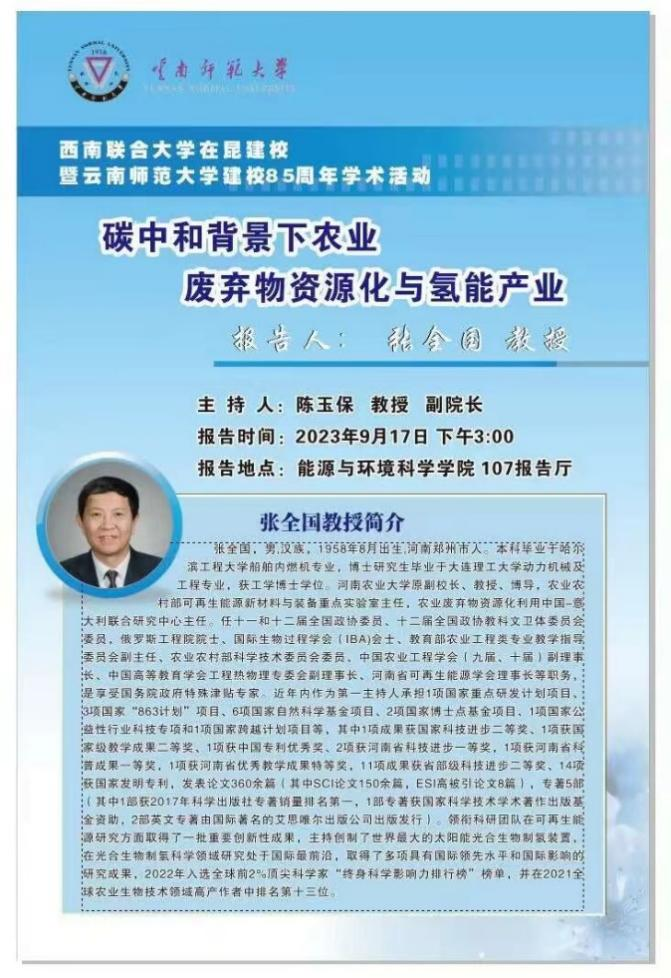 9月17日,河南农业大学原副校长张全国教授受邀为能源与环境科学学院师生作题为《碳中和背景下农业废弃物资源化与氢能产业》的学术讲座,该讲座作为西南联合大学在昆建校暨云南师范大学建校85周年学术活动之一。