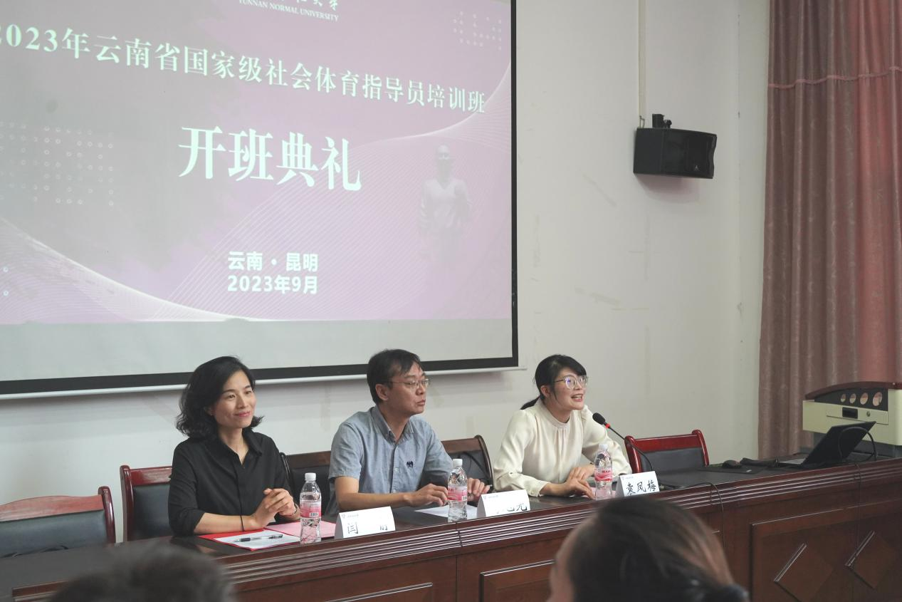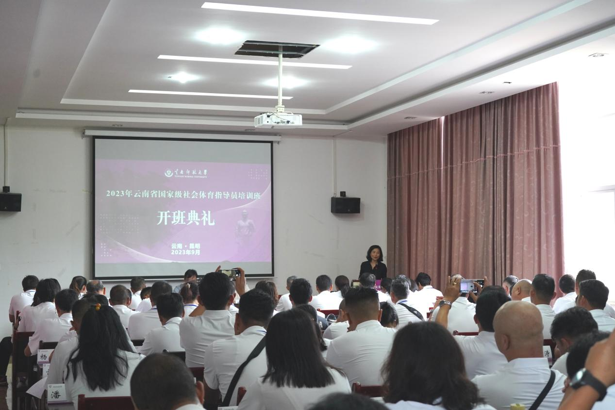 为深入贯彻落实《全民健身条例》,进一步加大社会体育指导员培训工作力度,提高社会体育指导员的基础理论知识和实践指导能力,9月21日,云南师范大学国家社会体育指导员培训基地承办的2023年云南省国家级社会体育指导员培训班举行开班典礼。云南省社会体育指导中心副主任杨光旭、我校体育学院院长闫静、云南省社会体育指导中心培训发展部主任廖蕾出席此次开班典礼。典礼由体育学院副院长袁凤梅主持。