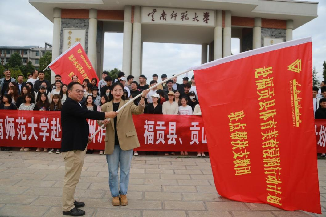 9月18日,云南师范大学赴怒江州泸水市、福贡县、贡山县体育美育浸润行动计划驻点帮扶支教团举行出征仪式。美术学院党委书记包绍红、院长戴杰鼓励参加浸润计划的同学们结合所在学校地域文化特点与现实条件,积极思考、创新思维、主动作为,在美育教学、社团活动、竞赛展演、校园文化、工作坊建设中团结协作、同心协力,圆满完成美育浸润行动计划。