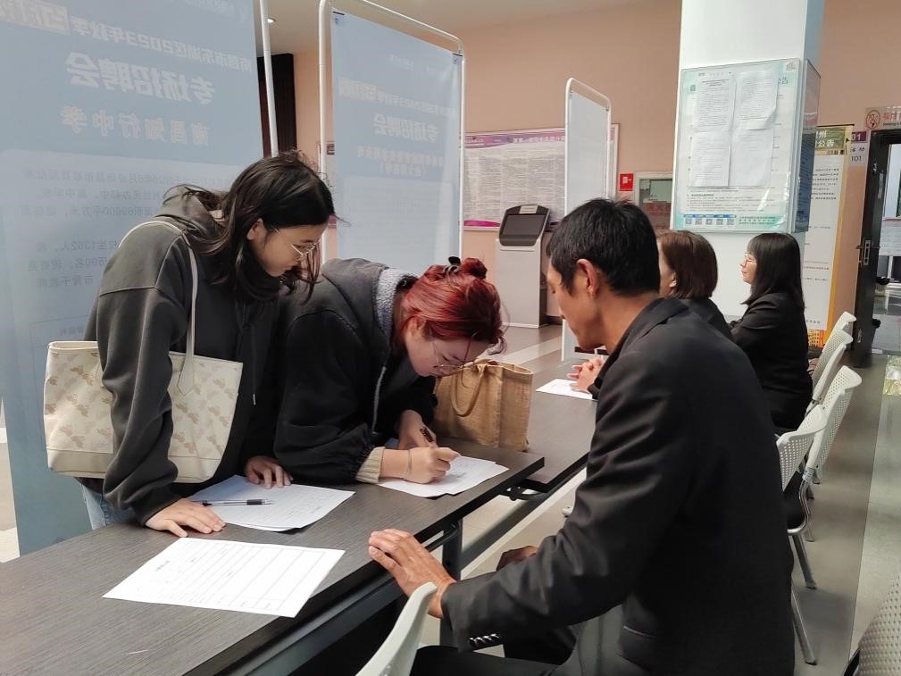 招聘会活动现场,南昌市东湖区20多家企事业单位的200多个岗位吸引了我校许多毕业生投递简历,通过双向咨询互动,200余名毕业生意向性投递简历。