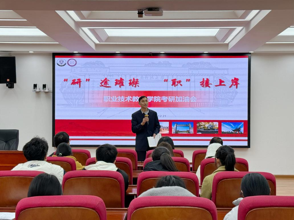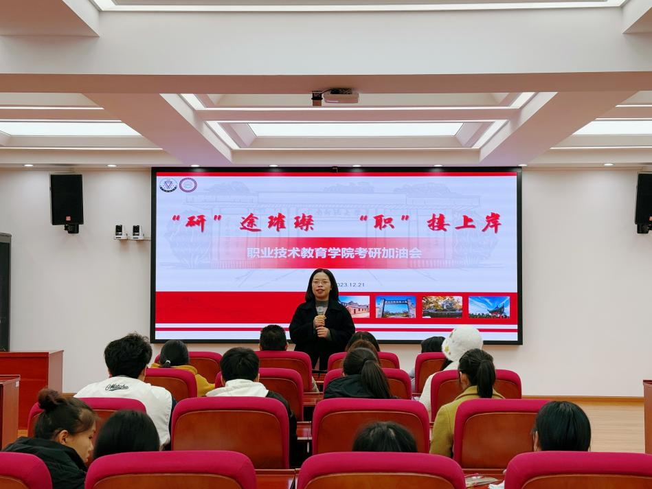 为增强考研学子备考信心,鼓舞考研士气,缓解考试压力,12月21日,职业技术教育学院在一二·一西南联大校区明睿楼报告厅召开“‘研’途璀璨 ‘职’接上岸”2024届毕业生考研冲刺会,学院院长牛元帅、党委副书记向斯楠、副院长王黎智、侯昌东、辅导员、毕业班班主任及2024届考研学子参加大会。