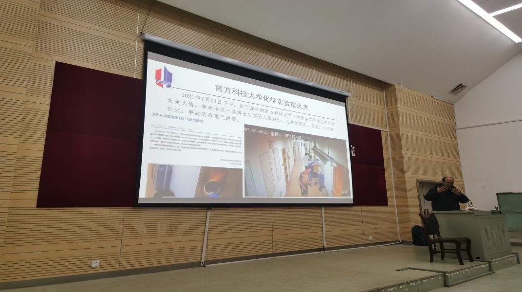 国家一级注册消防工程师高卫东首先为师生们讲述《实验室消防安全管理》。他通过国内高校近年来发生的实验室安全事故等相关案例,敲响师生们必须加强实验室安全意识的警钟,对实验室常见问题隐患、主要事故分类、事故原因、消防安全管理、常见消防灭火设施器材使用方法以及火场逃生与自救等方面进行详细讲解,为化工、生科、能环、地理、物电等学院的实验室安全员和研究生上了一堂生动的实验室消防教育课。