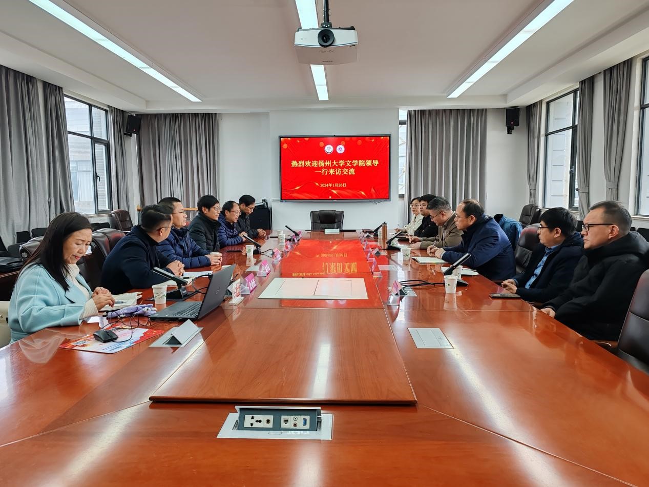 1月26日,扬州大学文学院党委书记李怀军、院长王定勇,副院长张堂会、王逊等一行到我校文学院调研交流。文学院领导班子参加了调研交流座谈会。