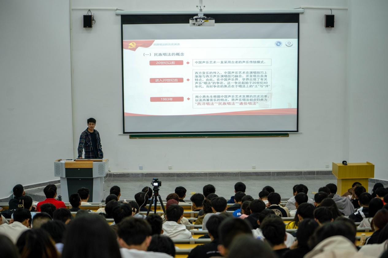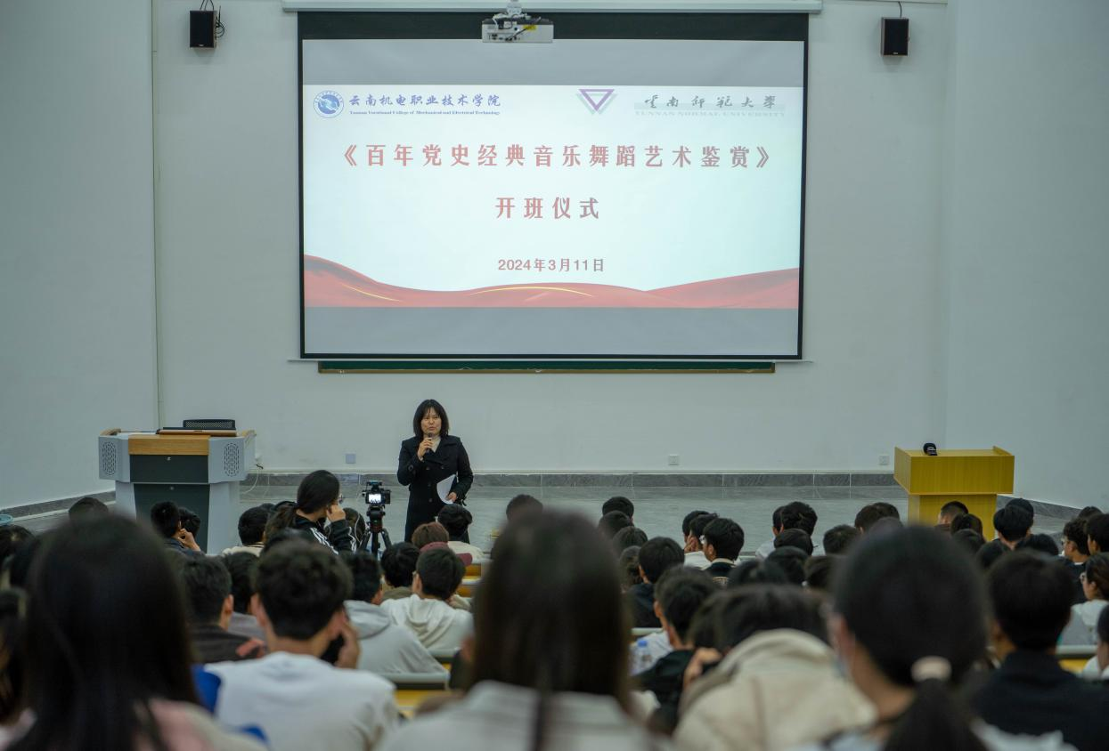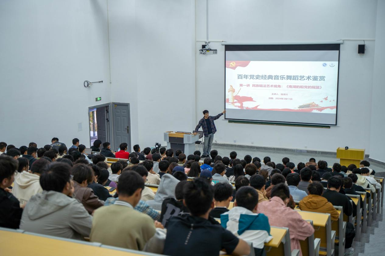 近日,我校音乐舞蹈学院《百年党史经典音乐舞蹈艺术鉴赏十八讲》项目受云南机电职业技术学院邀请在该校合作开设美育选修课。经过前期接洽和积极筹备,课程于3月11日晚在云南机电职业技术学院杨林校区正式开讲。我校音乐舞蹈学院青年教师钱泽川讲授课程第一讲:民族唱法艺术视角《南湖的船党的摇篮》。