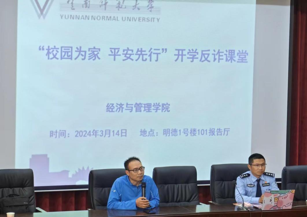 为了增强大学生安全意识,使同学们进一步认识到反诈防骗教育的紧迫性和重要性,及时接种“反诈疫苗”,增强反诈免疫力,掌握防范要领,3月14日下午,经济与管理学院邀请反诈专家-昆明市公安局呈贡分局刑侦大队刘文贤警官在明德一号楼报告厅开展防诈反诈教育、法治教育等相关内容的讲座。