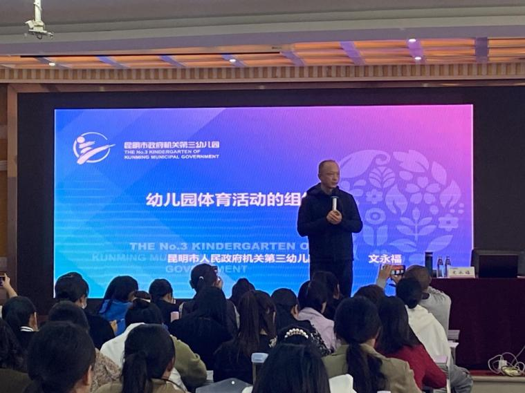 第二场讲座由昆明市政府机关第三幼儿园园长文永福主讲,以“幼儿园体育活动的组织”为主题,文永福结合众多幼儿园体育教育教学案例,细致生动地讲述幼儿园体育教育要点与组织策略。