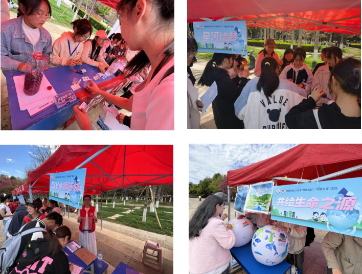 本次主题活动由“水质探索与监测”、“星河绘梦”、“DIY水循环袋”、“共绘生命之源”、“湖泊猜猜猜”、“水知识竞答”等活动组成,旨在让师生们了解更多水资源保护的知识,增强师生保护水资源的意识。
