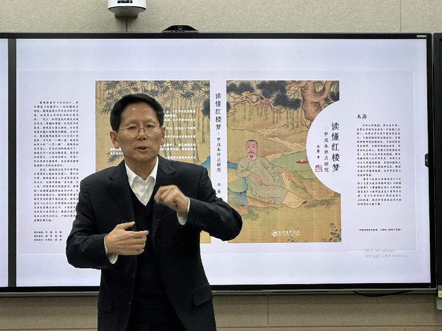 3月24日,扬州大学特聘教授、博士生导师、香港大学荣誉研究员、世界汉学研究会会长、中国苏轼研究会副会长、中央电视台百家讲坛主讲人木斋教授应邀做客云南师范大学文学院“一多中文讲座”第105讲,在明德三号楼智慧教室开展“读懂红楼梦——胭脂斋重写石头记”专题讲座。讲座由文学院副院长杨吉华教授主持,邱美琼教授担任对讲嘉宾,学院相关专业研究生到场聆听。