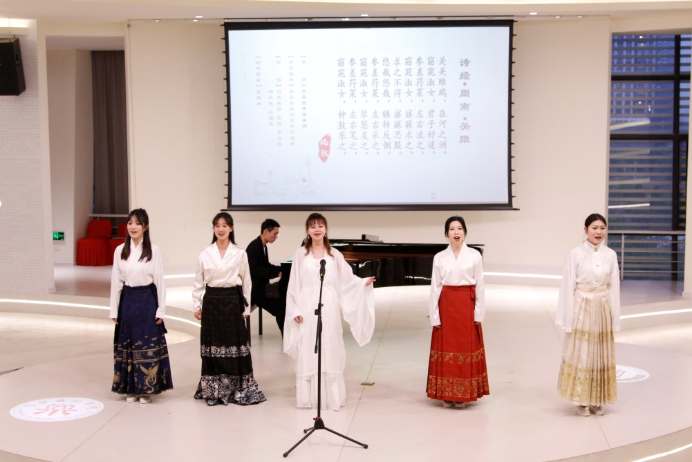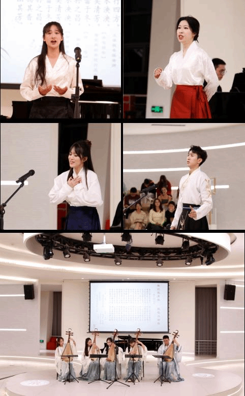 我国传统的诗词曲赋都有着优美的节奏韵律,是可以入乐演唱的韵文。《诗经》三百篇,“孔子皆弦歌之。”《诗经》是我国古代诗歌的开端,这次演出也在观众齐诵《关雎》的朗朗声中拉开序幕。合唱《关雎》悠扬婉转,演唱指导刘蕊老师独唱《秋风词》凄婉动人。此外,音乐舞蹈学院的同学分别演唱了《幽兰操》《虞美人•春花秋月何时了》《山之高》《江城子•十年生死两茫茫》,或颂扬君子之节操,或抒发离人之哀思。琵琶五重奏《春江花月夜》将演出推向高潮。活动在观众合唱《水调歌头•明月几时有》的歌声中结束。整场演出让观众在传统诗词与现代音乐的交融中,感受经典与时代的共鸣。