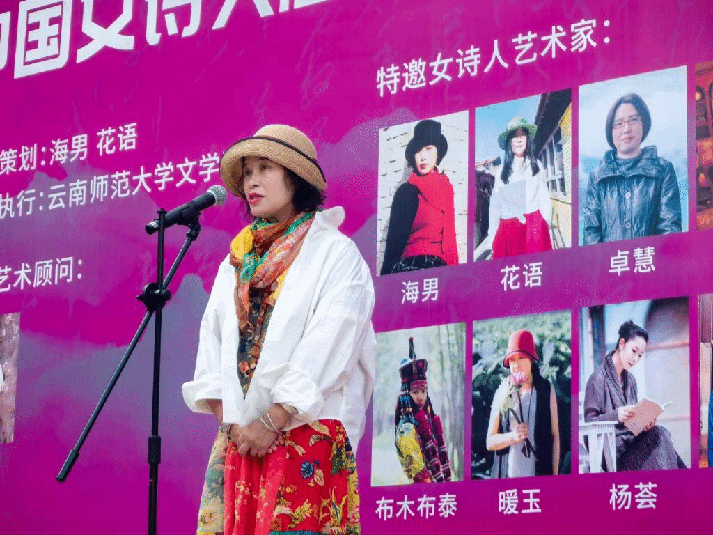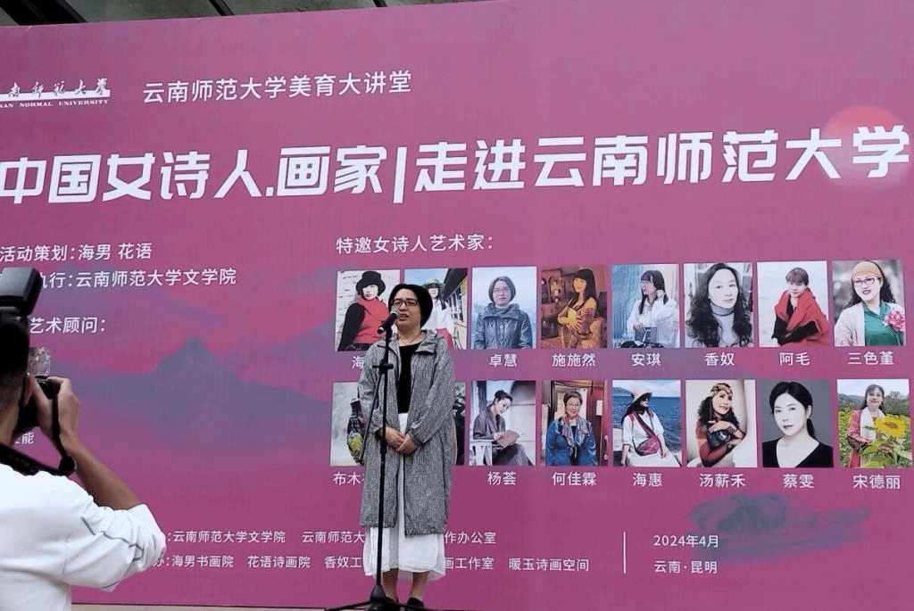 4月28日上午,由云南师范大学文学院、社会科学工作办公室主办,海男书画院、花语诗画院、阿毛诗画工作室等协办的“中国女诗人·画家走进云南师范大学”活动,在呈贡校区明德三号楼广场开幕。
