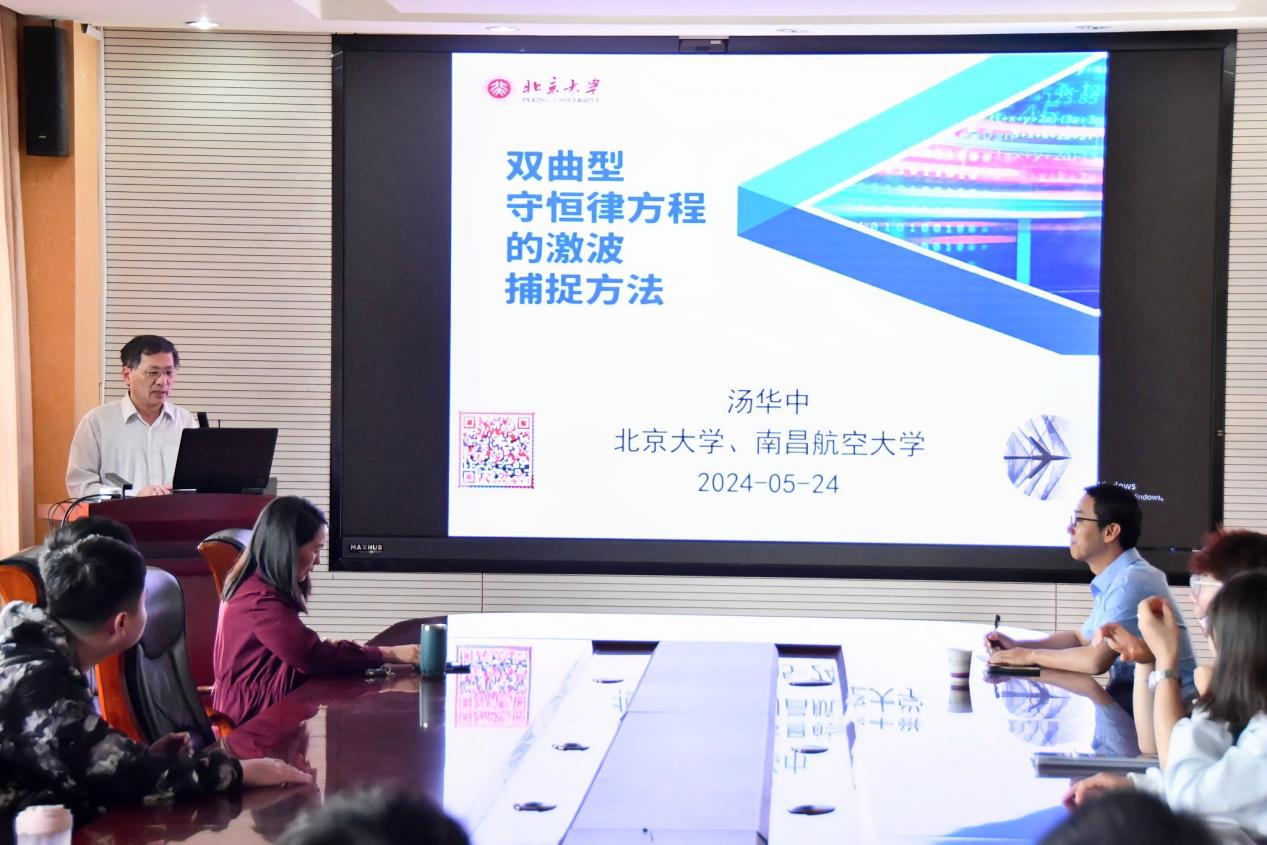 5月24日,由云南师范大学主办、数学学院承办的“联大高端学术论坛”在武之楼会议室举行,北京大学数学科学学院博雅特聘教授,博士生导师,南昌航空大学党委常委、副校长汤华中作了题为《双曲型守恒律方程的激波捕捉方法》的学术报告,数学学院30余名师生聆听了报告。报告由数学学院院长刘祥清主持。