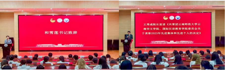 学院院长王秀成宣读了《共青团云南师范大学云南华文学院、国际汉语教育学院委员会关于表彰2023年先进集体和先进个人的决定》,同时鼓励受表彰的团学组织和青年学子珍惜荣誉,再创佳绩。
