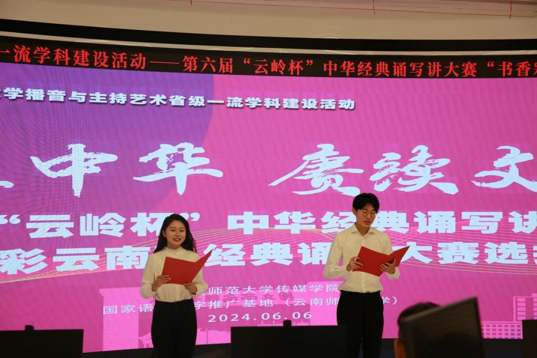 6月6日,为弘扬中华经典文化,建设书香校园,由国家语言文字推广基地(云南师范大学)和传媒学院共同举办的第六届“云岭杯”中华经典诵读大赛选拔赛在传媒学院举行。传媒学院语言传播系老师张齐、褚彦、谭辉担任评委。