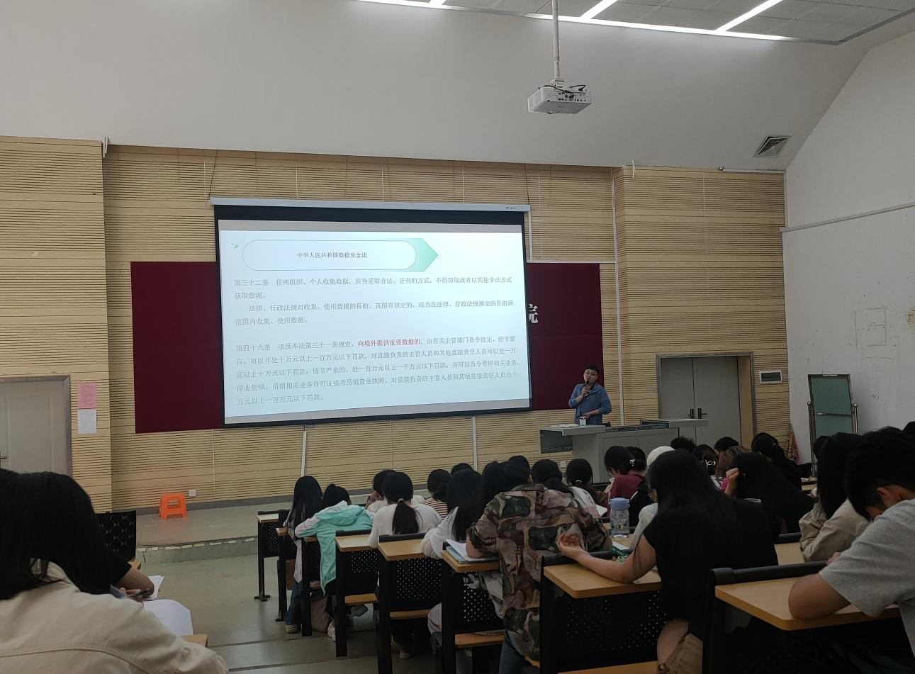 学院团委书记周晓光老师围绕《中国共产党纪律处分条例》《网络安全法》《数据安全法》及《个人信息保护法》等法律法规,结合同学们日常生活密切相关的部分规定,通过具体讲解和案例分析的方式让同学们真正理解其含义,帮助同学们提升个人法律意识,遵守法律底线。