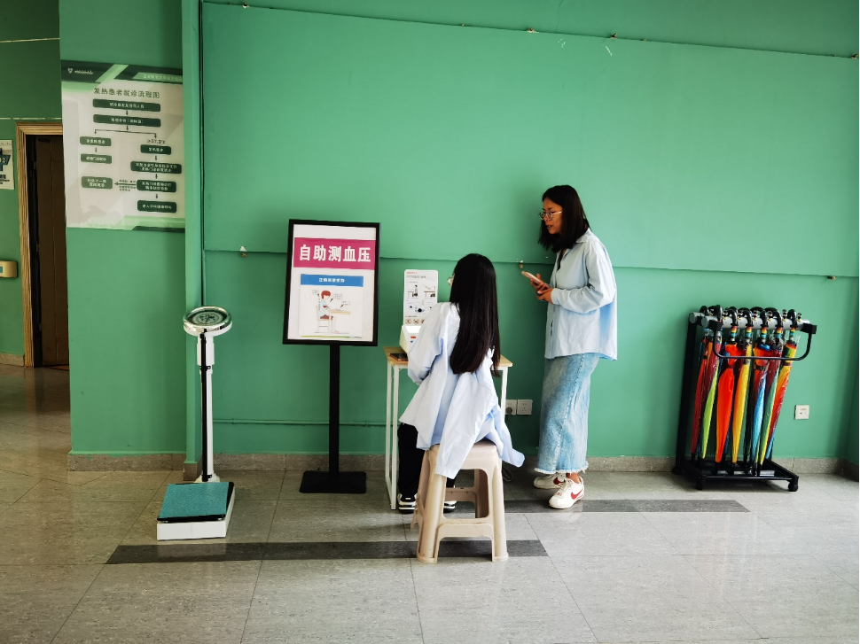 校医院在门诊一楼大厅设置“便民服务角”,配备了袖筒式自动血压测量仪、体重秤、雨伞等物品,通过一次血压的测量、体重的检测、雨伞的借用……让师生感受到校医院的温暖。