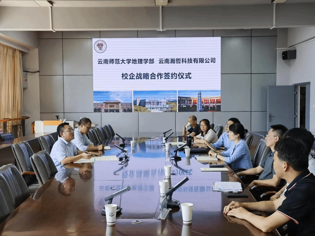 8月28日,云南瀚哲科技有限公司董事长、地理学部校友邓昌军与公司科研主任王琳一行到访我校地理学部,共商校企合作。地理学部党委书记周妍、主任陈光杰、副主任罗毅以及地理空间信息学院副院长王加胜、专业负责人等参加签约仪式,签约仪式由周妍主持。